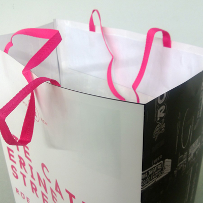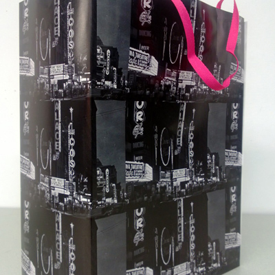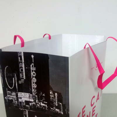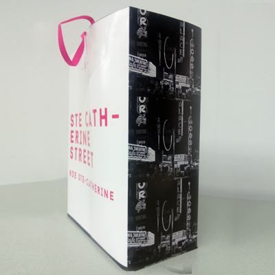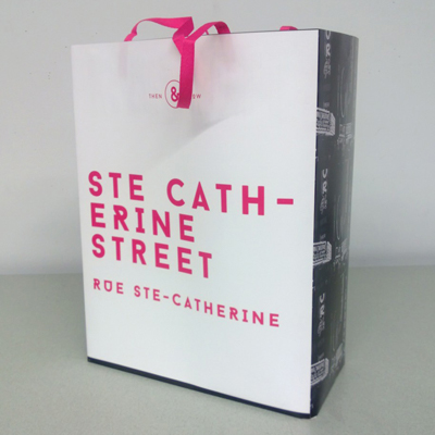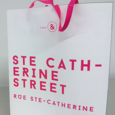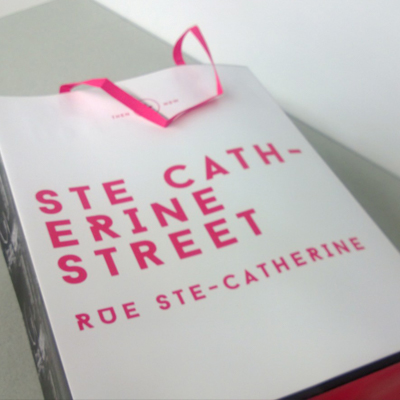 Ste Catherine today has flourished as a commercial location. We combined a vintage photo of Ste Catherine street with bold and modern typography and a splash of pink to create this shopping bag souvenir.
